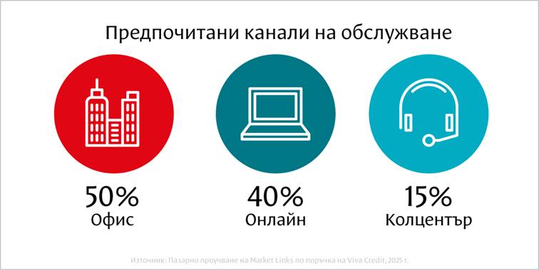 Физическите офиси продължават да играят водеща роля – 50% от клиентите кандидатстват на място, особено за първи кредит. В същото време онлайн услугите вече са трайно наложени, особено в големите градове – 40% от пазара използва дигитални канали, а при Viva Credit делът е дори по-висок.